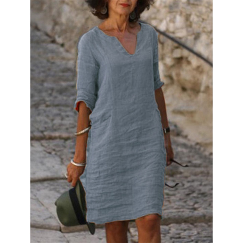 Cotton Linen Dress Vintage Casual V Neck Loose Waist Midi Beach Dress Women Clothing stitching retro solid color dress for women